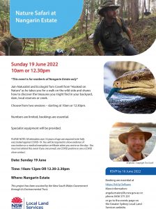 You and your family members are invited to participate in a special Nangarin Nature Safari conducted by Naturalist and Ecologist Tom Covell. This Community event is organised by Greater Sydney Local Land Services and assisted by the NSW Environmental Trust. Bookings are essential and numbers are limited so please register promptly to avoid disappointment – see flyer details below: